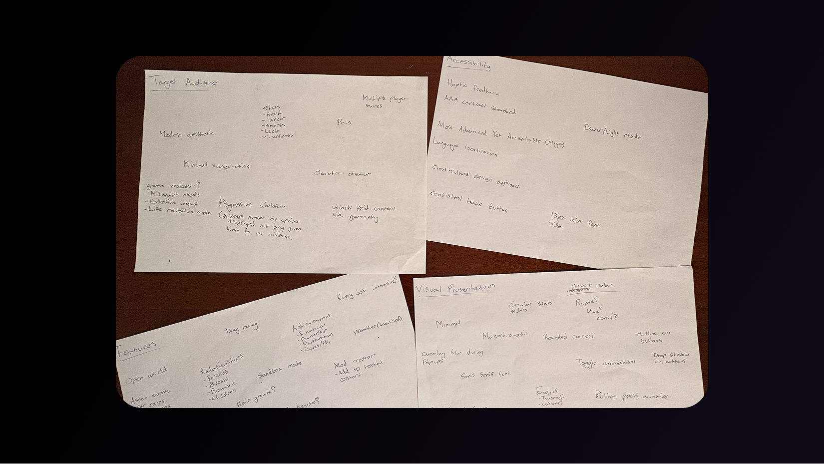 Before starting the design process, I unleashed all of the ideas which had built up to this very moment. For brainstorming I decided to layout my raw ideas onto 4 sheets of paper, with each piece of paper being a category. The categories were features, visual presentation, accessibility, and target audience.