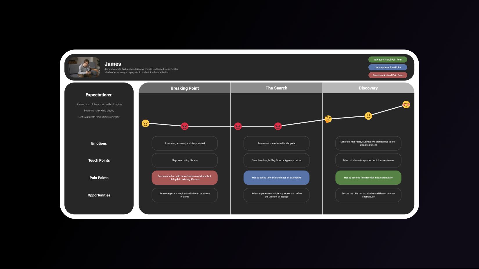 To further empathise with the target audience and the journey they may go through. To create this journey map, I mapped out the touch points, pain points, expectations, and opportunities that a player within the target audience may go through before discovering Genworld.