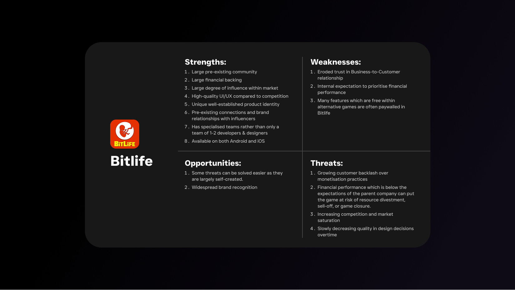 While there are alternatives to market leaders such as Bitlife, Bitlife remains at the forefront due to its superior quality of design and feature execution, advantageous access to large financial and talent resources, and carefully crafted product identity. For a market alternative to have potential to successfully compete against Bitlife it needs to tick the following boxes:
