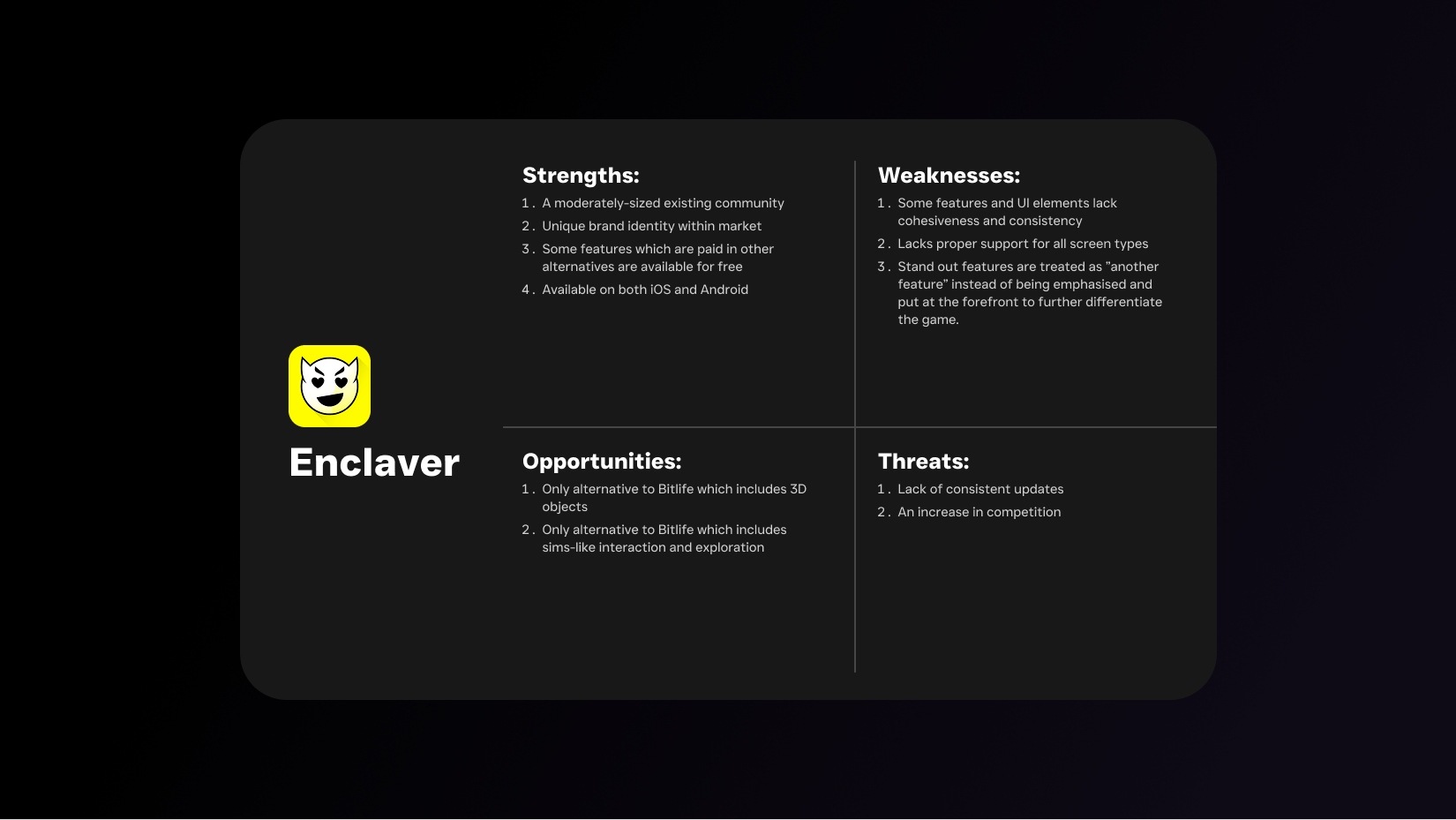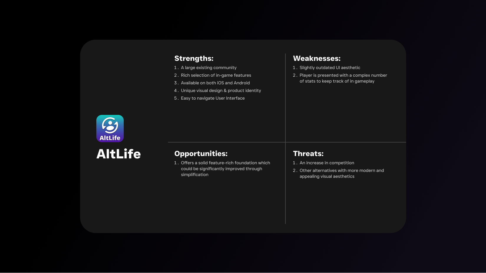 Before diving into the project, I set out to understand a bit more about the existing alternatives using a SWOT analysis.