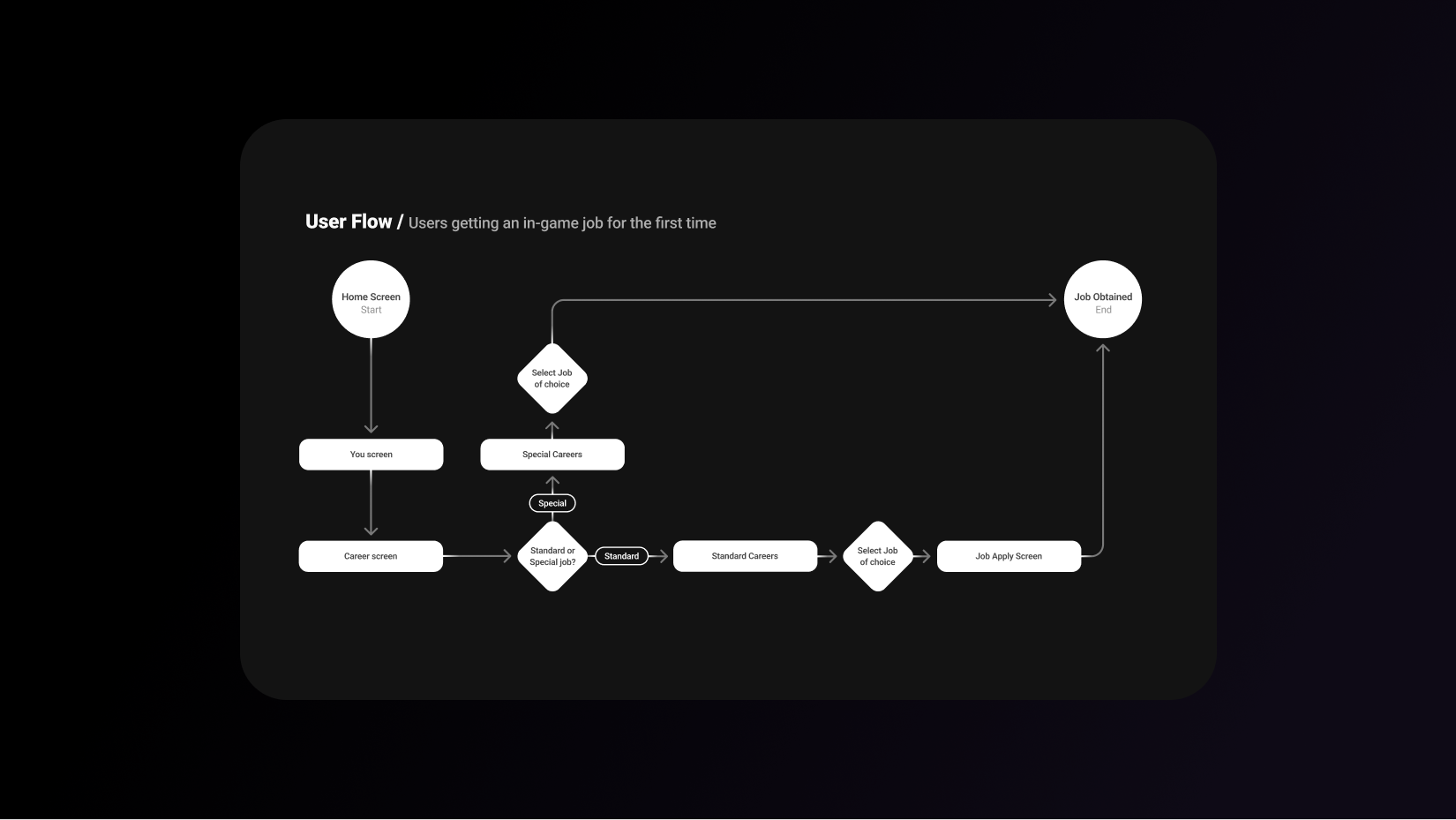 After deciding on a concept, I used Maze to test the user flows within a high fidelity mockup. From the 72 participants, the success rate for task completion within the prototype was good, but users commonly misclicked two key buttons while completing the task. This highlighted that while most users successfully completed the task of getting their first in-game job, many users had moments of confusion regarding what to press.
